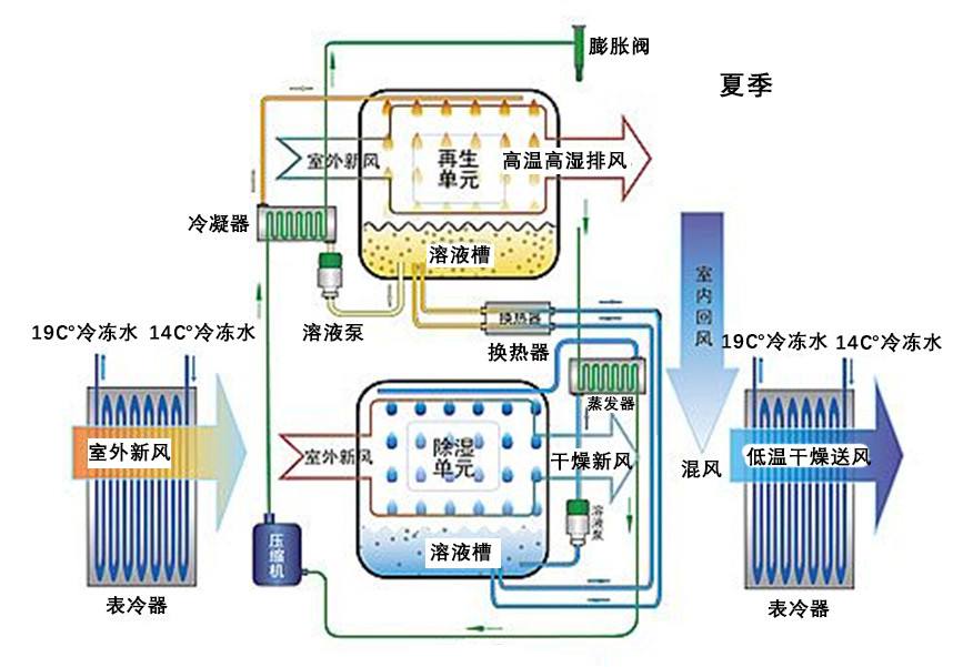 溶液除濕空調系統利用溶液直接處理空氣 ,在室內風機盤管中沒有冷凝水 ,因而避免了傳統空調系統中風機盤管的凝水盤滋生細菌的問題。另外 , 常用的除濕鹽溶液 ,如氯化鋰、溴化鋰、氯化鈣等均具有殺滅細菌微生物等作用。已有測試表明 , 常溫下 3 mL 溴化鋰溶液能夠在 3 h 內殺死 5 萬個XL 12blue 實驗細菌。氯化鋰溶液能殺死葡萄球菌、鏈球菌、肺炎桿菌、大腸桿菌、變形菌、綠膿桿菌、壞疽菌等 。實際系統中 ,病菌在鹽溶液停留的時間較長 ,為溶液的殺菌提供了條件。