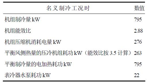 該測試系統(tǒng)在測試時,運用表冷器能夠使得冷熱量自平衡,最大限度地利用風冷冷(熱)水機組使用側(cè)的冷量與熱源側(cè)的熱量交換,熱源側(cè)的熱量被使用側(cè)的冷量平衡后剩余的只有壓縮機的功率這部分熱量需要通過冷卻設備散去,并不需要消耗大量的能量來單獨平衡使用側(cè)產(chǎn)生的冷量和熱源側(cè)產(chǎn)生的熱量。而且風冷冷(熱)水機組的能效比越高,同等制冷量下,需要測試系統(tǒng)散去的壓縮機功率也就越少,測試系統(tǒng)也越節(jié)能。以800kW風冷冷(熱)水機組制冷為例,表冷器的運用對測試系統(tǒng)的耗能比較見表1。