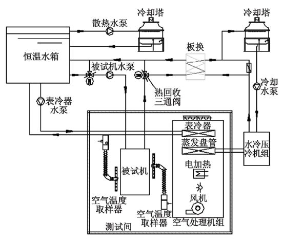 風冷冷()水機組測試時,通過空氣處理機組將風冷冷()水機組風側(cè)產(chǎn)生的冷熱量進行處理,使得測試間內(nèi)的溫濕度達到國標要求的值。而機組產(chǎn)生的冷熱水回到水箱后,通過水箱配置的冷熱源進行平衡,從而達到機組在國標要求的工況下穩(wěn)定運行,采集系統(tǒng)將所有的測點采集,通過電腦內(nèi)專業(yè)計算軟件進行計算輸出實驗報告。