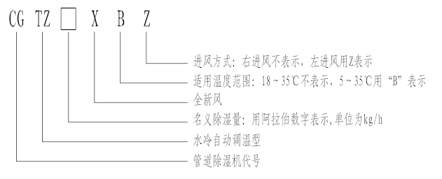 1. CGTZ60X:表示名義除濕量為60kg/h,進風方式為右進風,適用溫度范圍為18℃~35℃的全新風水冷自動調溫型管道除濕機