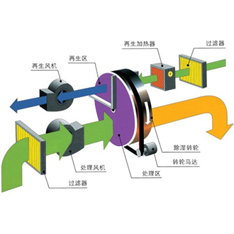 同時,在再生區域,另一路空氣先經過再生加熱器后,變成高溫空氣(一般為100~140度)并穿過吸濕后的轉輪,使轉輪中已吸附的水份蒸發,從而再生空氣因水份的蒸發而變成濕空氣,同時溫度下降;之后,再通過再生風機將濕空氣排除到室外